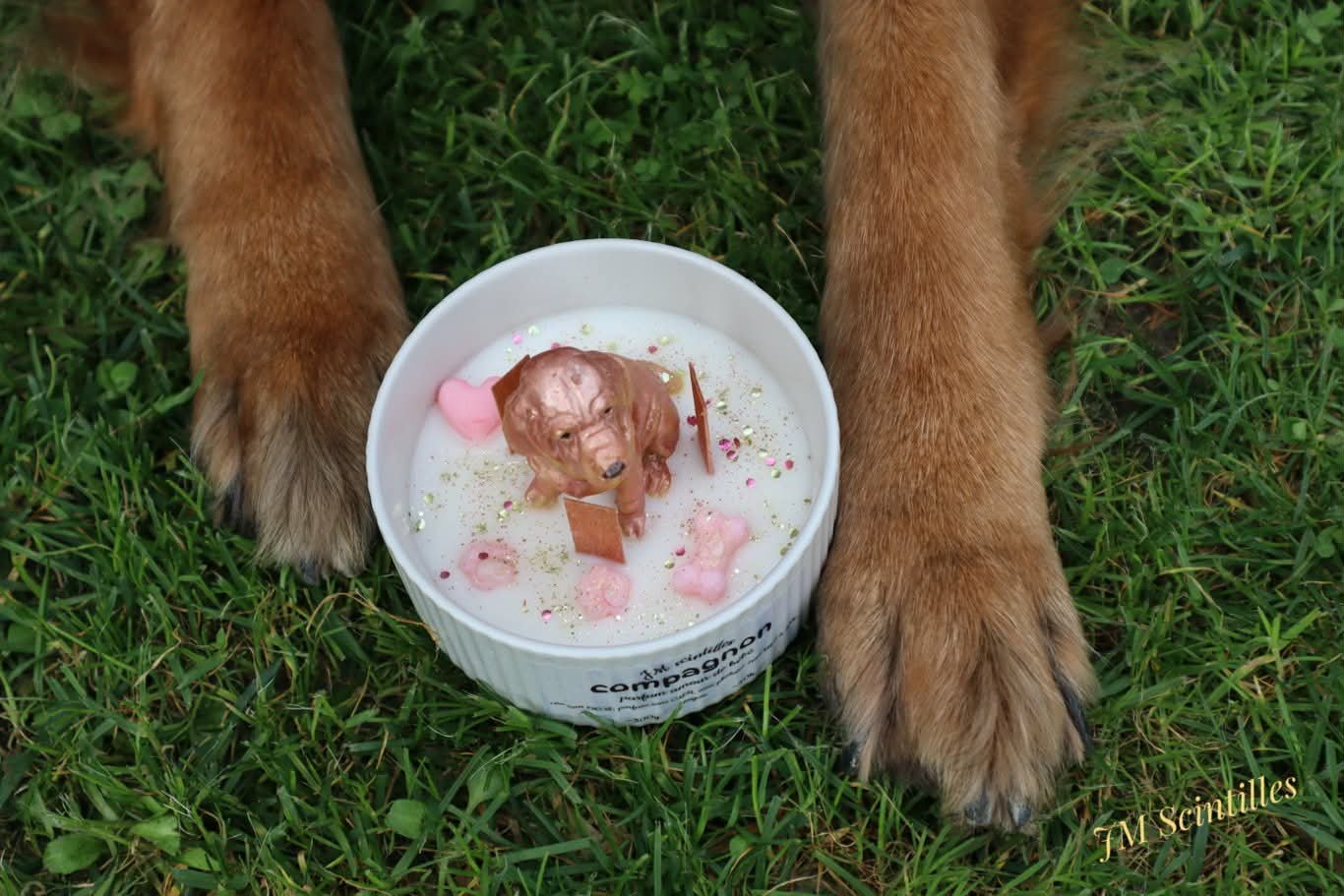 Elle est coulée dans un bol blanc. Décorée d’un chien, de trace de pattes,… , aux couleurs marron, rose, dorée,…parsemée de paillettes.