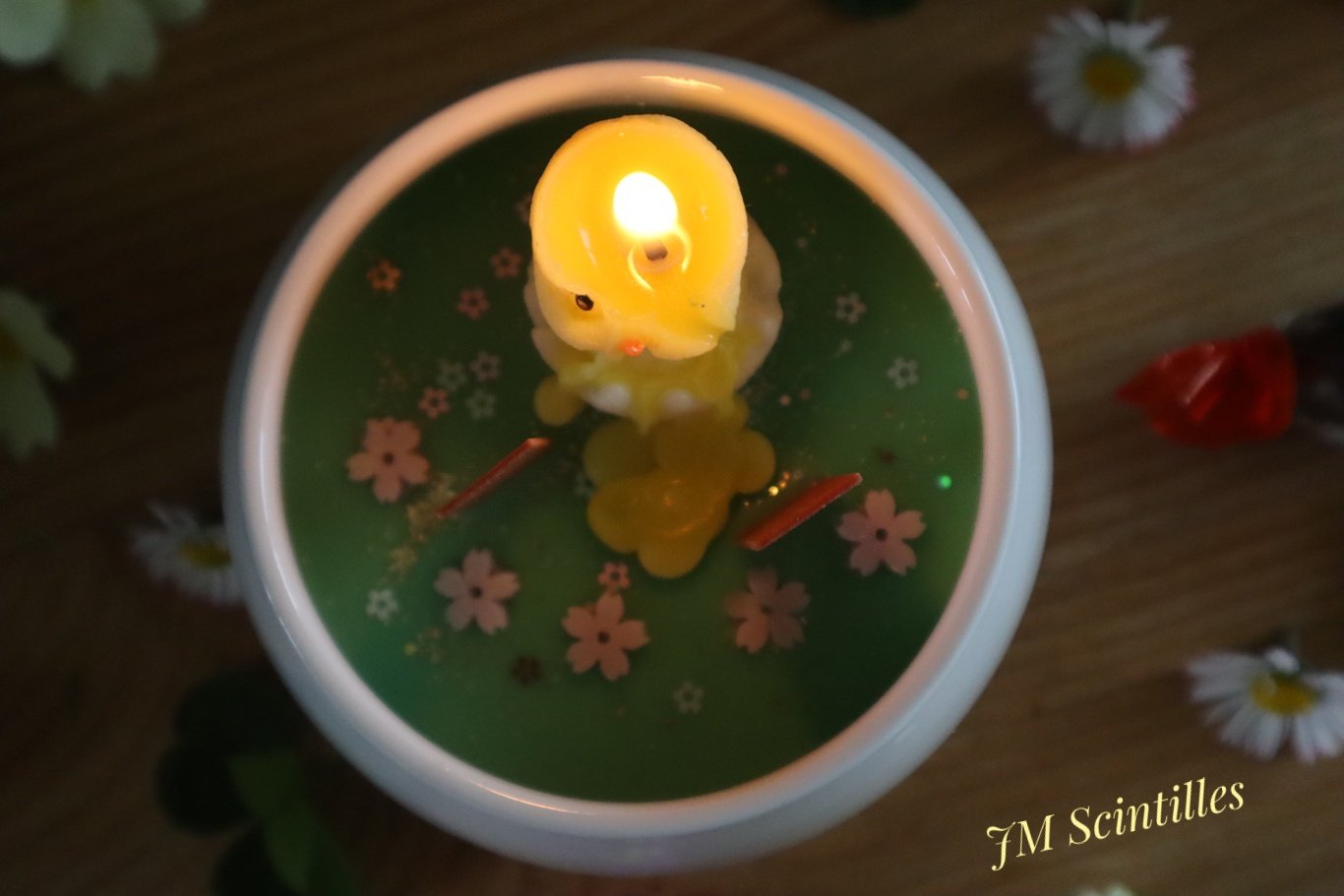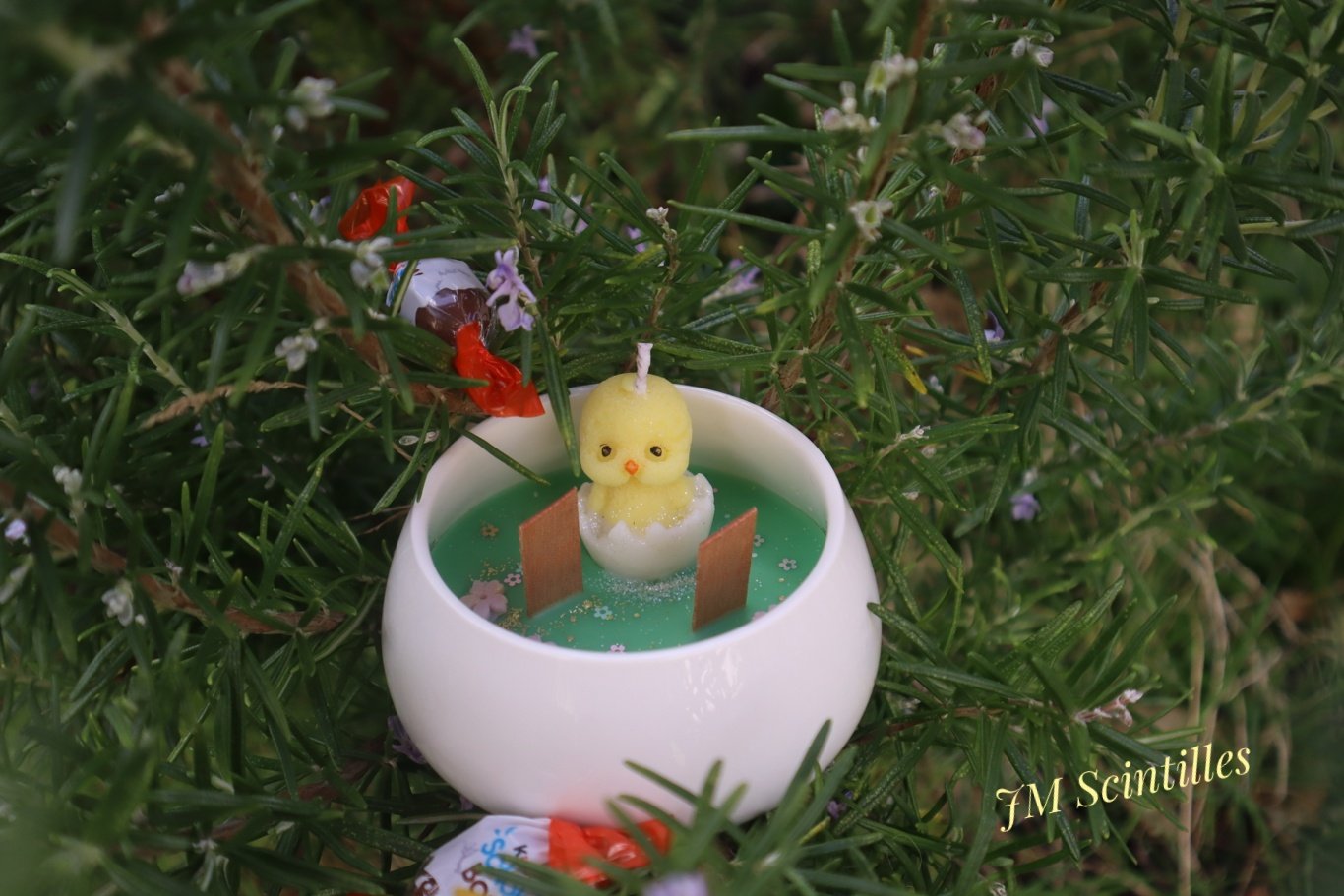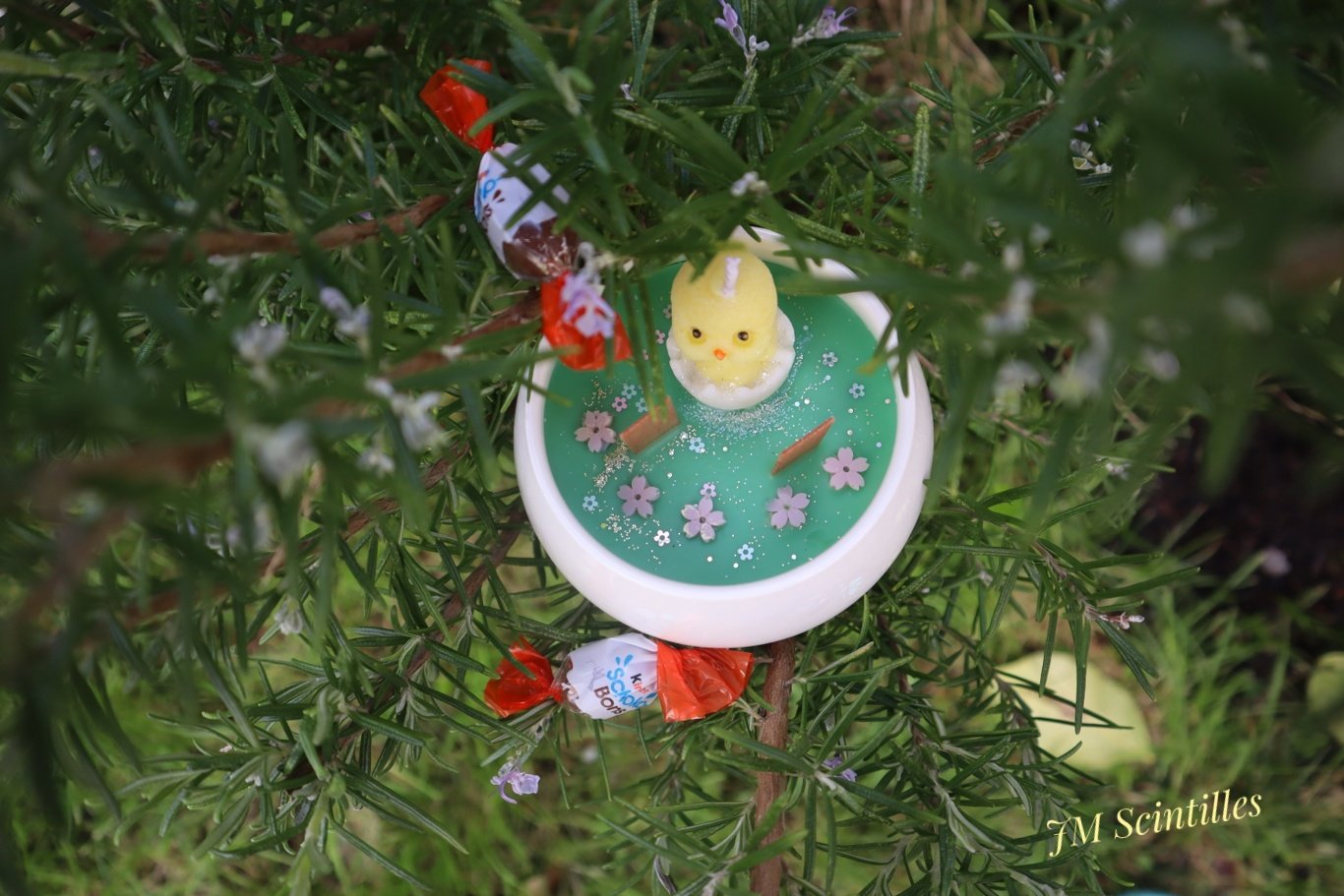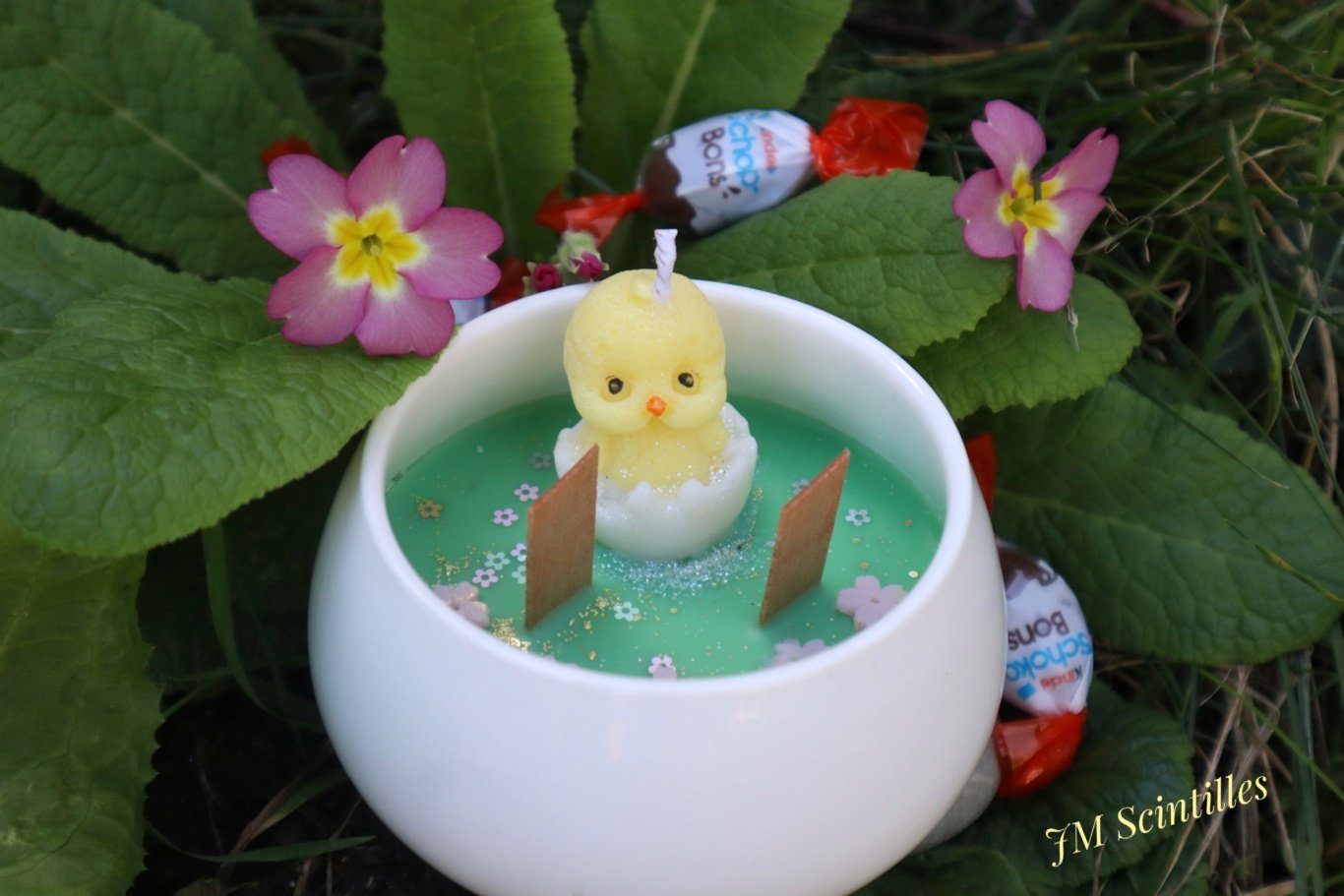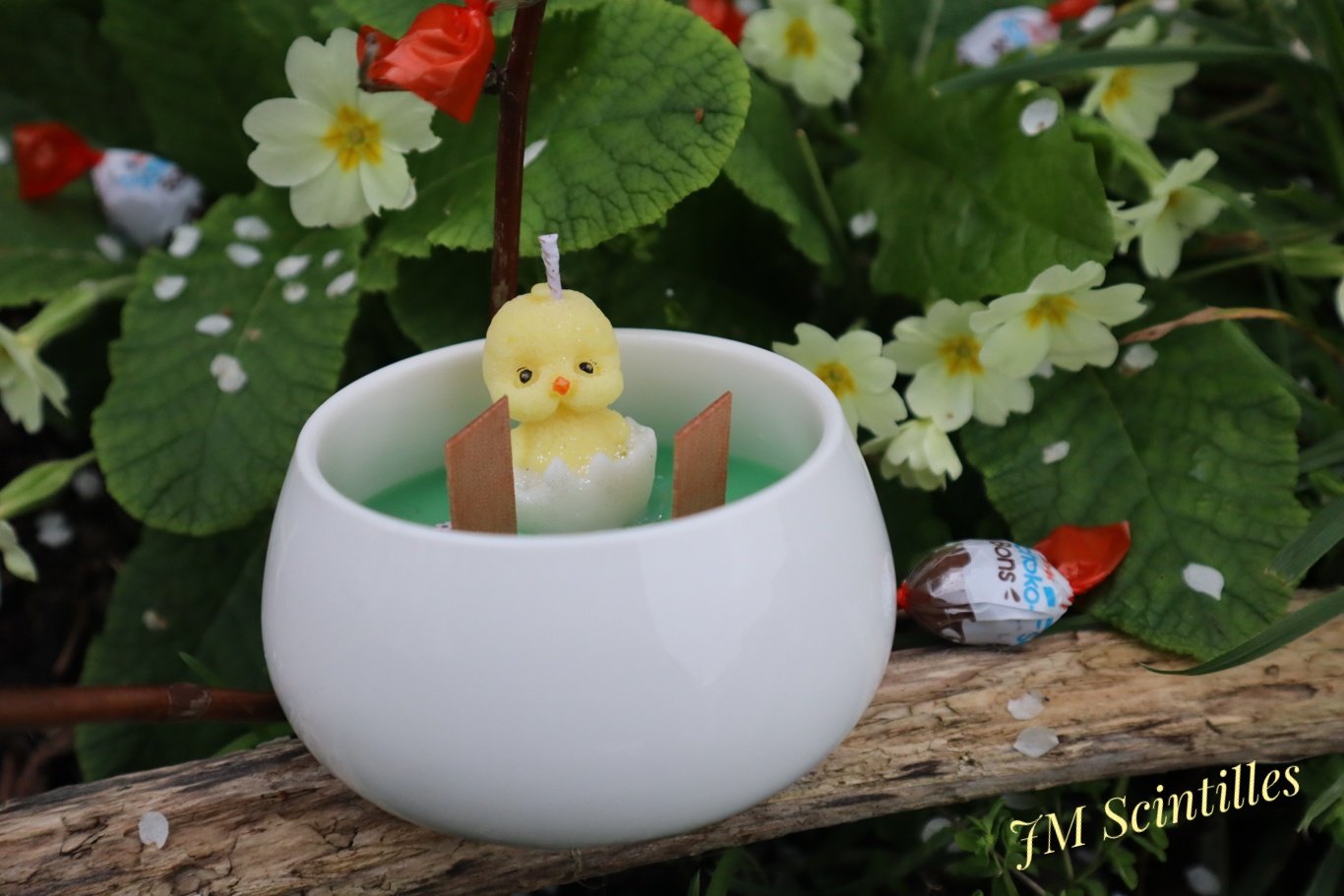 Elle est coulée dans un bol blanc. Décorée d’un poussin venant d’éclore, de petites fleurs,… , aux couleurs verte, jaune, mauve et parsemée de paillettes.