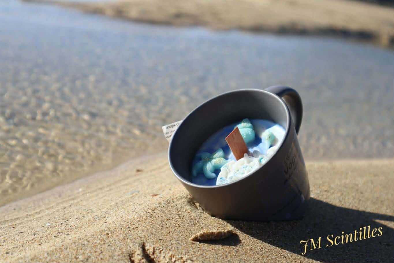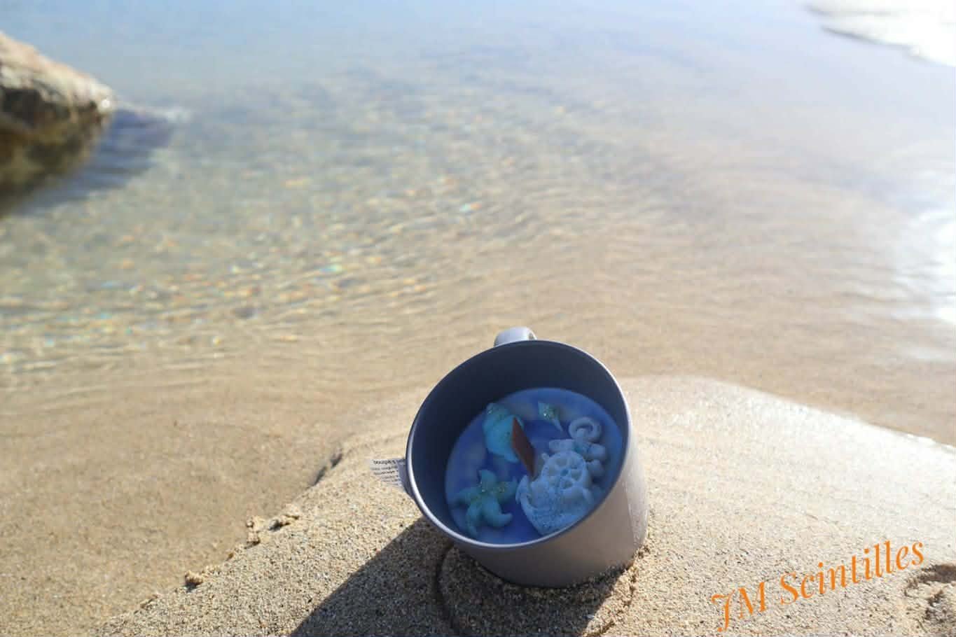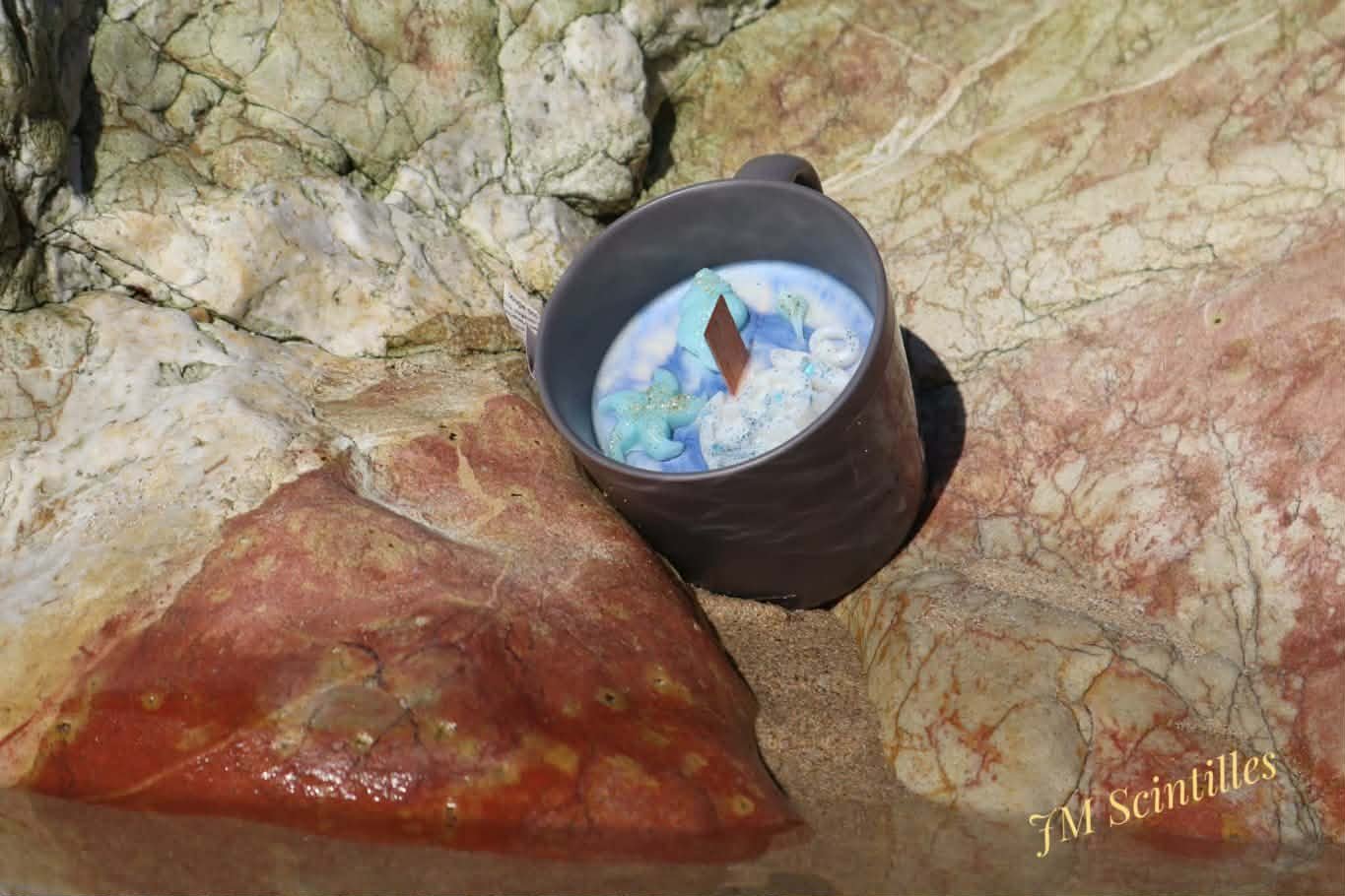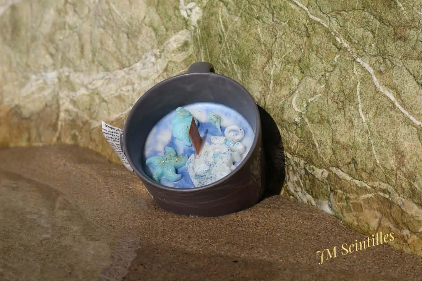 Elle est coulée dans une tasse grise, écriture dorée » Pause Douceur « . Décorée d’une ancre, coquillages, aux couleurs turquoise, bleu, blanc, parsemée de paillettes bleues, dorées.