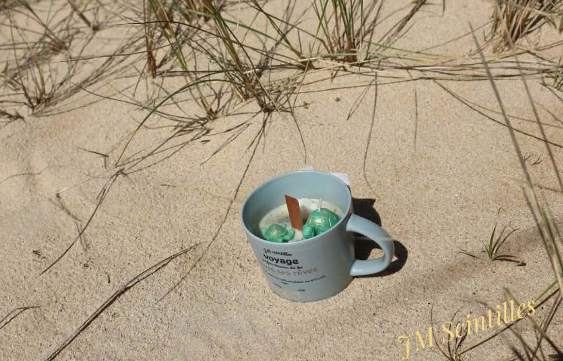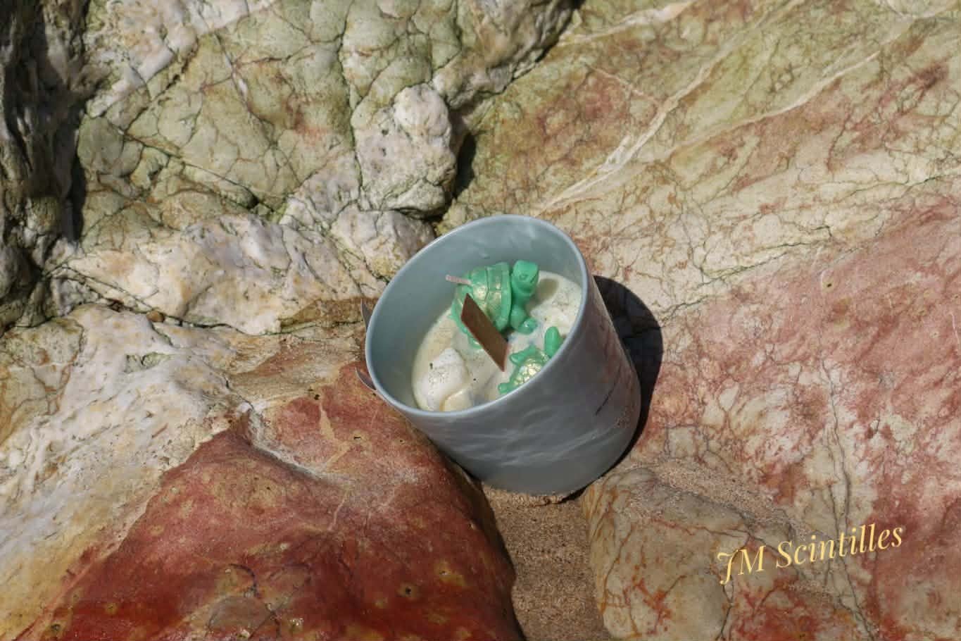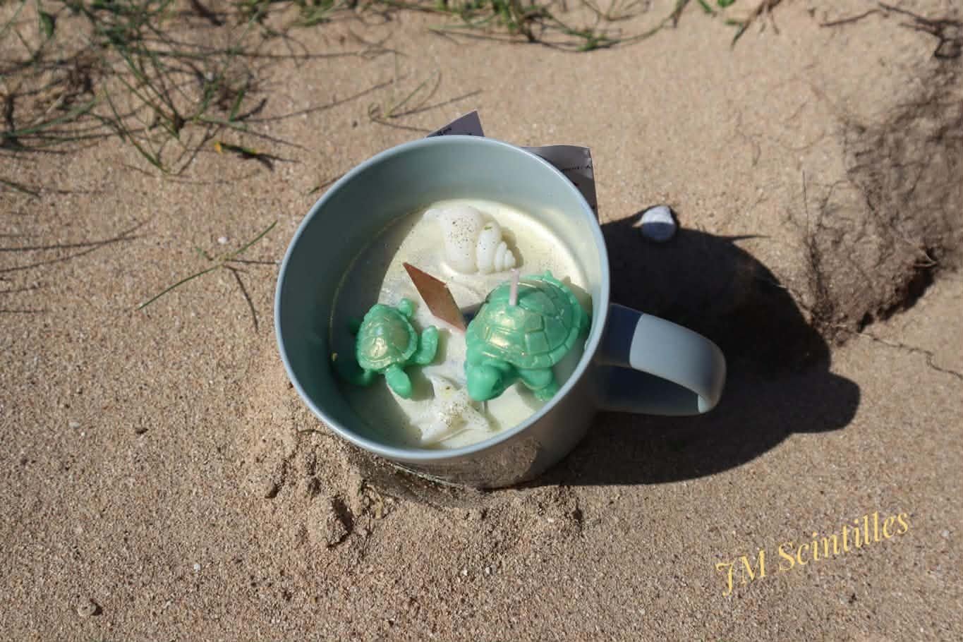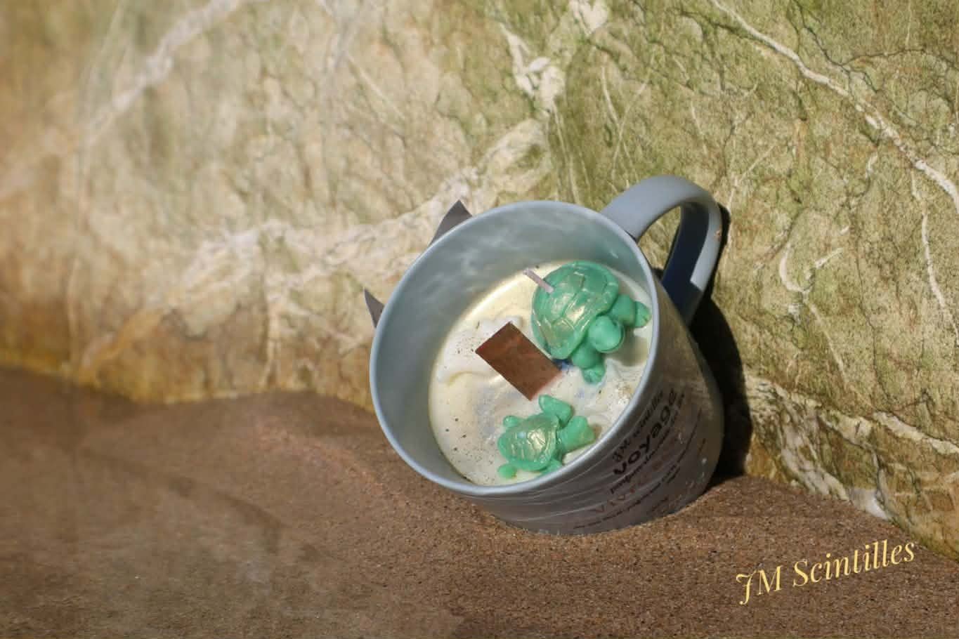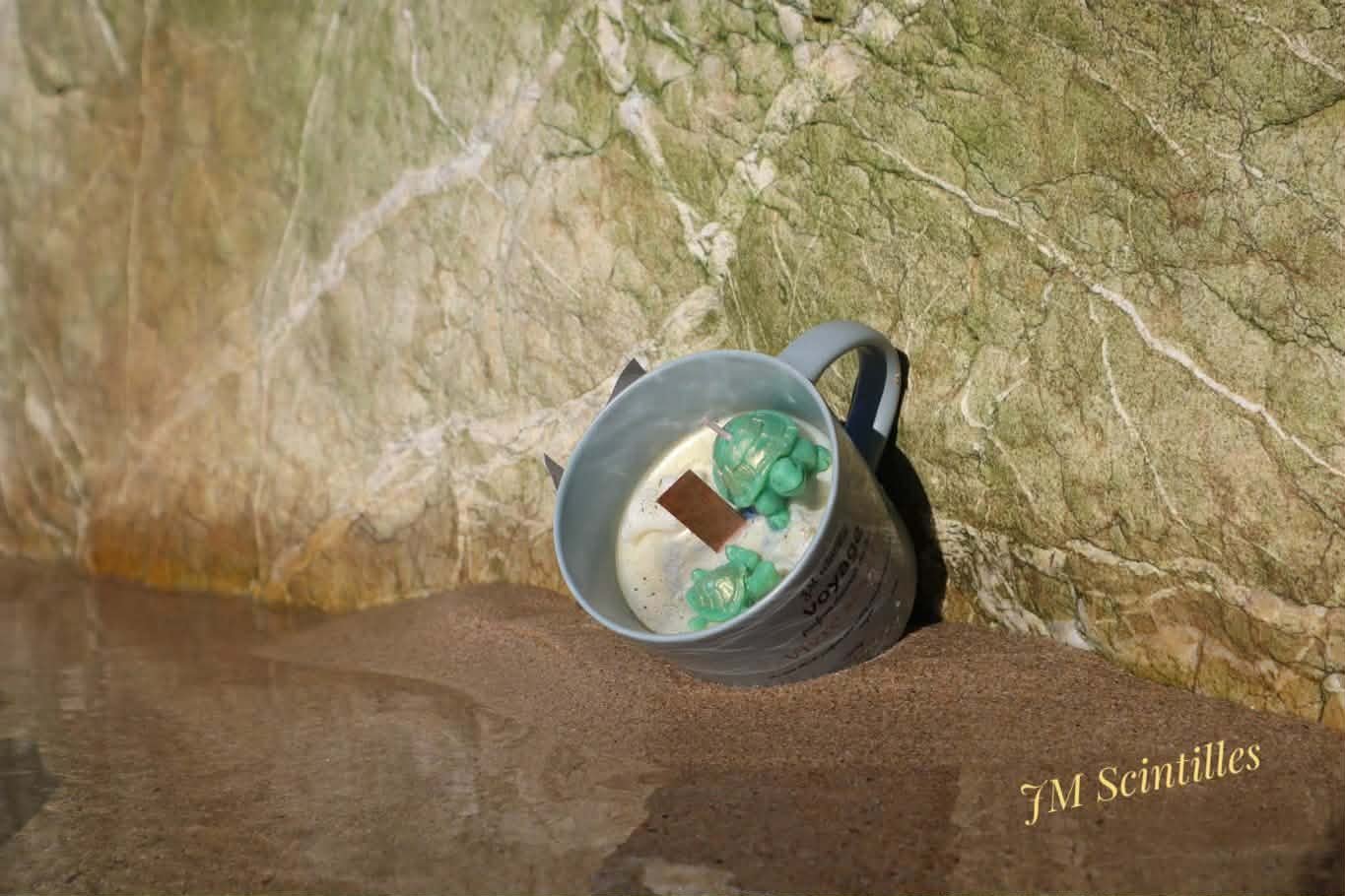 Elle est coulée dans une tasse bleu. écriture dorée  » Vivre ses rêves ». Décorée d’une petite et d’une grande tortues, coquillages, aux couleurs verte, blanche, parsemée de paillettes dorées.