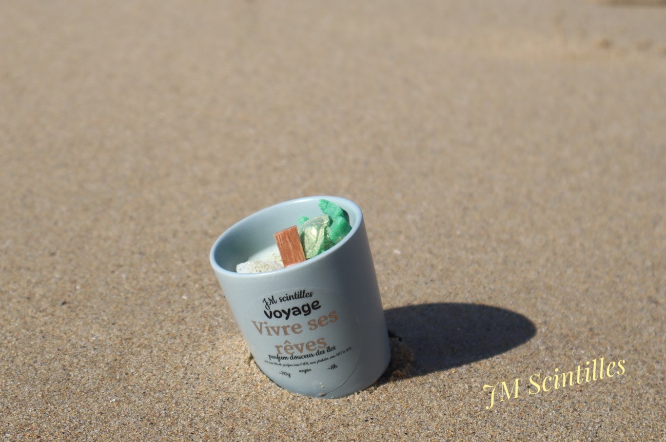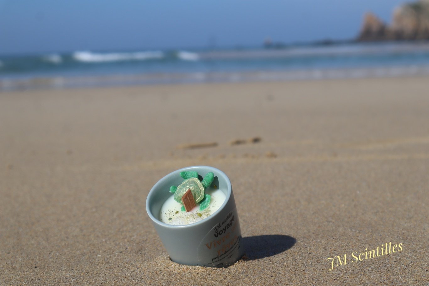 Elle est coulée dans un verre . Ecriture dorée  » Vivre ses rêves ». Décorée d’une petite tortue, coquillages, aux couleurs verte, blanche, parsemée de paillettes dorées.