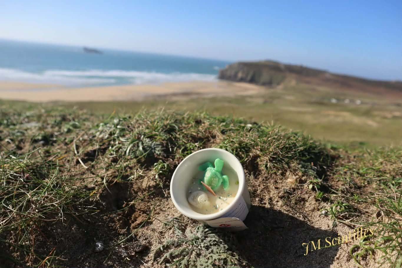 Elle est coulée dans un verre .  Ecriture dorée  » Vivre ses rêves ». Décorée d’une petite tortue, coquillage, aux couleurs verte, blanche, parsemée de paillettes dorées.